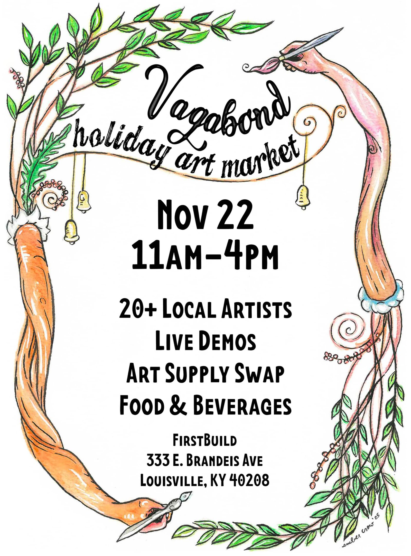 November 22 from 11am-4pm, Vagabond Holiday Art Market will have several local artists, an art supply swap table, live demonstrations from artists and FirstBuild along with locally made snacks and beverages. FirstBuild, an inventor and maker space for the community, is also offering the space for free for this event. FirstBuild would like to increase attendance on Saturdays and let the community know their maker space is available for use for very low fees. If the community has a need, you can create a solution at FirstBuild with their computers, printers, 3D printers, laser cutters, blacksmithing shop and more.